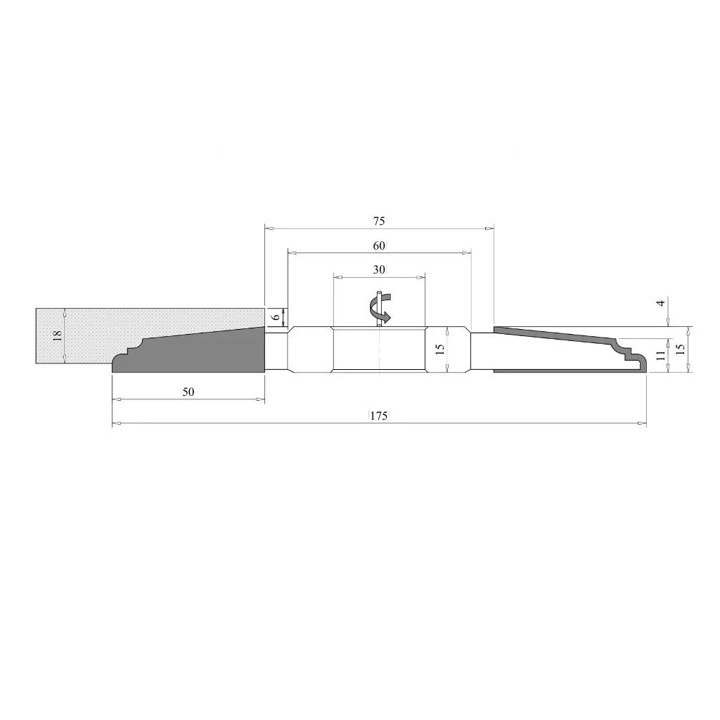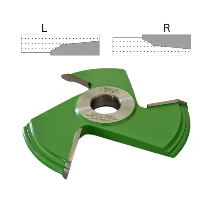Abplattfräser 175x15x63x30 mm Z3 L links-unten HM HW für Massivholz, MDF und andere Holzwerkstoffe, Kunststoff, zur Herstellung von Paneelen und Türfüllungen für Rahmenkonstruktionen. Professionelles Fräswerkzeug für Tischfräsen zur Holzbearbeitung mit Hartmetall-Schneiden (vidia) und mit komplex geschwungenem Profil.