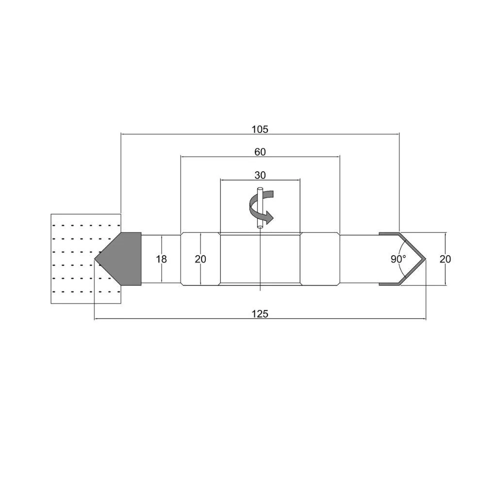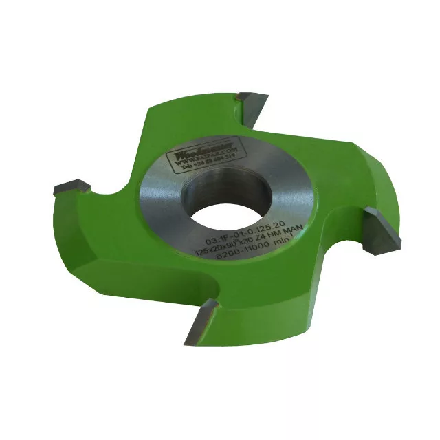 Fasefräser 90° mit 125 mm Durchmesser, 20 mm Breite, 4 Messern, HM, mit gelöteten Schneidplatten, mit Durchmesser Bohrung von 30 mm. Woodmaster Fräskopf in Industriequalität für die Holzbearbeitung mit Tigra Germany Hartmetall-Schneiden.