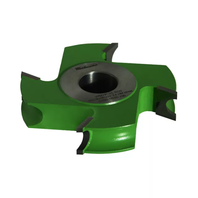 Konkaver Halbstabfräser mit 25 mm Radius, 150 mm Durchmesser, 50 mm Breite, 4 Messern, HM, mit gelöteten Schneidplatten, mit Durchmesser Bohrung von 30 mm. Woodmaster Fräskopf in Industriequalität für die Holzbearbeitung mit Tigra Germany Hartmetall-Schneiden.