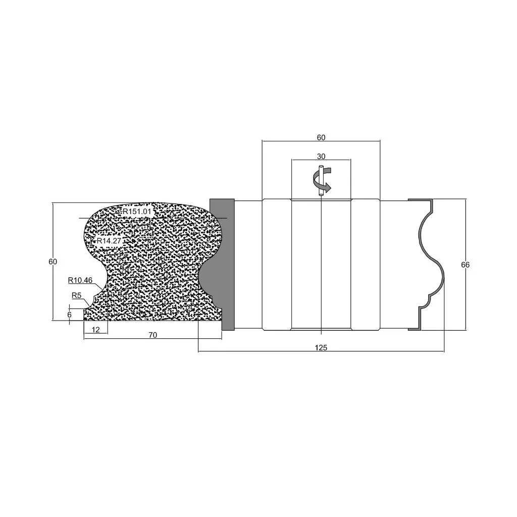 Handlauf-Profilfräser mit 125 mm Durchmesser, 68 mm und 62 mm Breite, 3 Messern, HM, mit gelöteten Schneidplatten, mit Durchmesser Bohrung von 30 mm. Woodmaster Fräskopf in Industriequalität für die Holzbearbeitung mit Tigra Germany Hartmetall-Schneiden.