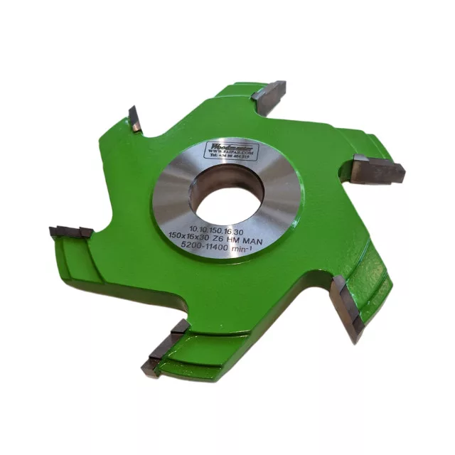 Kantengetriebefräser mit 150 mm Durchmesser, 16,3 mm Breite, 6 Messern, HM, mit gelöteten Schneidplatten, mit Durchmesser Bohrung von 30 mm. Woodmaster Fräskopf in Industriequalität für die Holzbearbeitung mit Tigra Germany Hartmetall-Schneiden.