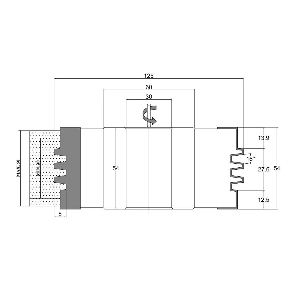 Minizinkenfräser mit 125 mm Durchmesser, 50 mm Breite, maximale Frästiefe von 9 mm, 3 Messern, HM, mit gelöteten Schneidplatten, mit Durchmesser Bohrung von 30 mm. Woodmaster Fräskopf in Industriequalität für die Holzbearbeitung mit Tigra Germany Hartmetall-Schneiden.