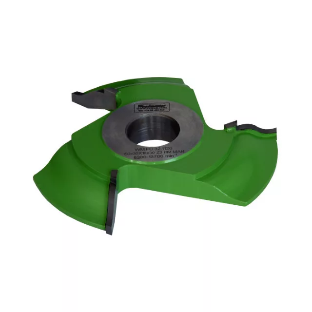 Profilfräser mit 150 mm Durchmesser, 20 mm Breite, 3 Messern, HM, mit gelöteten Schneidplatten, mit Durchmesser Bohrung von 30 mm. Woodmaster Fräskopf in Industriequalität für die Holzbearbeitung mit Tigra Germany Hartmetall-Schneiden.