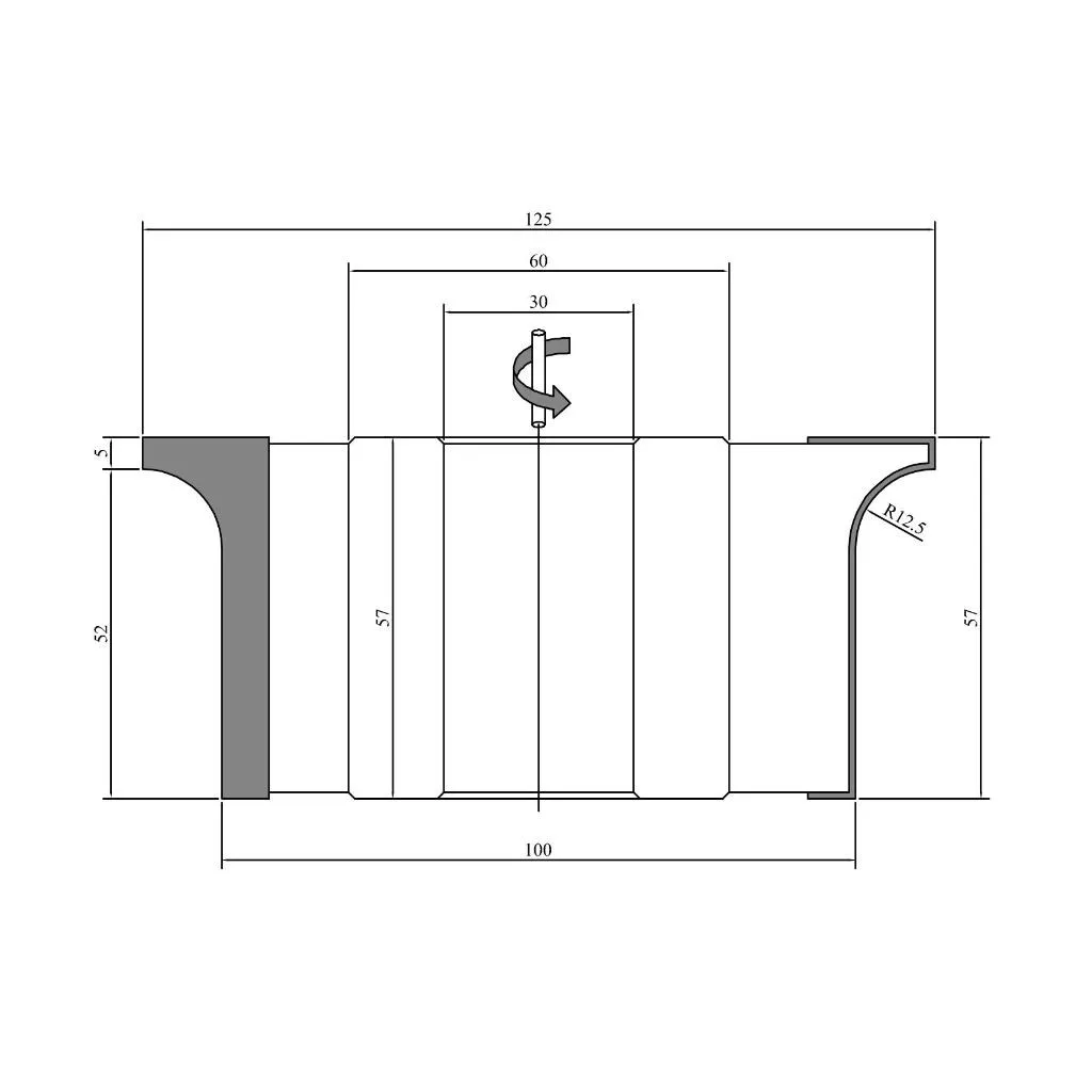 Radienfräser mit 12,5 mm Radius, 125 mm Durchmesser, 57 mm Breite, 3 Messern, HM, mit gelöteten Schneidplatten, mit Durchmesser Bohrung von 30 mm. Woodmaster Fräskopf in Industriequalität für die Holzbearbeitung mit Tigra Germany Hartmetall-Schneiden.