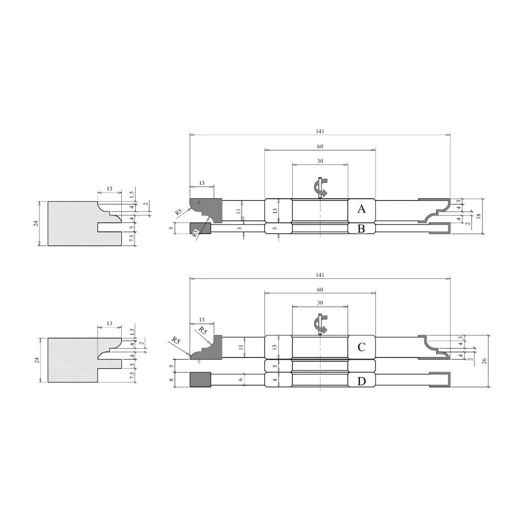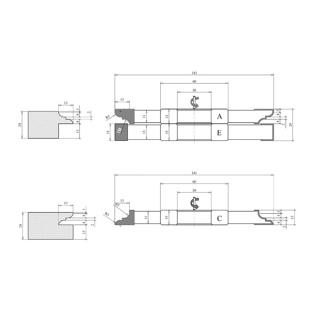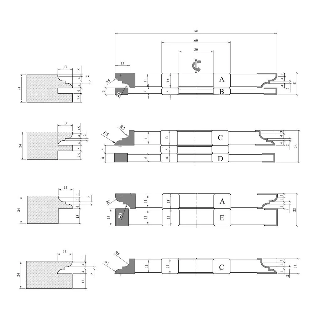 Profil-Konterprofil Fräserset mit HM-Vidia-Schneiden: Wählen Sie HM-Fräser in Industriequalität für die Bearbeitung von Massivholz, MDF und anderen agglomerierten Produkten und Holzwerkstoffen. Fräser aus Hartmetall (Wolframkarbid) zeichnen sich durch extreme Härte und hohe Verschleißfestigkeit aus. Dies macht diese Fräswerkzeuge zu einer hervorragenden Wahl zum Schneiden von Massivholz, Halbhartholz und Hartholz (wie Eiche, Akazie, Ulme, Buche, Ahorn, Walnuss), Weichholz (wie Kiefer, Zeder, Zypresse, Pappel, Linde), laminierten Holzwerkstoffen (wie laminierte Spanplatten, furnierte Spanplatten, MDF, Sperrholz) sowie Kunststoffen und Verbundwerkstoffen (wie PVC, Acryl).