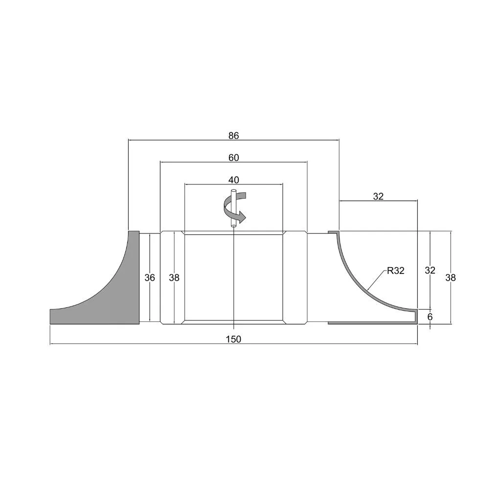 Konkaver Viertelstabfräser mit 32 mm Radius, 150 mm Durchmesser, 38 mm Breite, 3 Messern, L (links), HM, mit gelöteten Schneidplatten, mit Durchmesser Bohrung von 40 mm. Woodmaster Fräskopf in Industriequalität für die Holzbearbeitung mit Tigra Germany Hartmetall-Schneiden.
