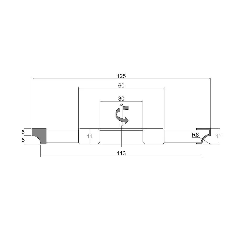 Konkaver Viertelstabfräser mit 6 mm Radius, 125 mm Durchmesser, 11 mm Breite, 3 Messern, R (recht), HM, mit gelöteten Schneidplatten, mit Durchmesser Bohrung von 30 mm. Woodmaster Fräskopf in Industriequalität für die Holzbearbeitung mit Tigra Germany Hartmetall-Schneiden.